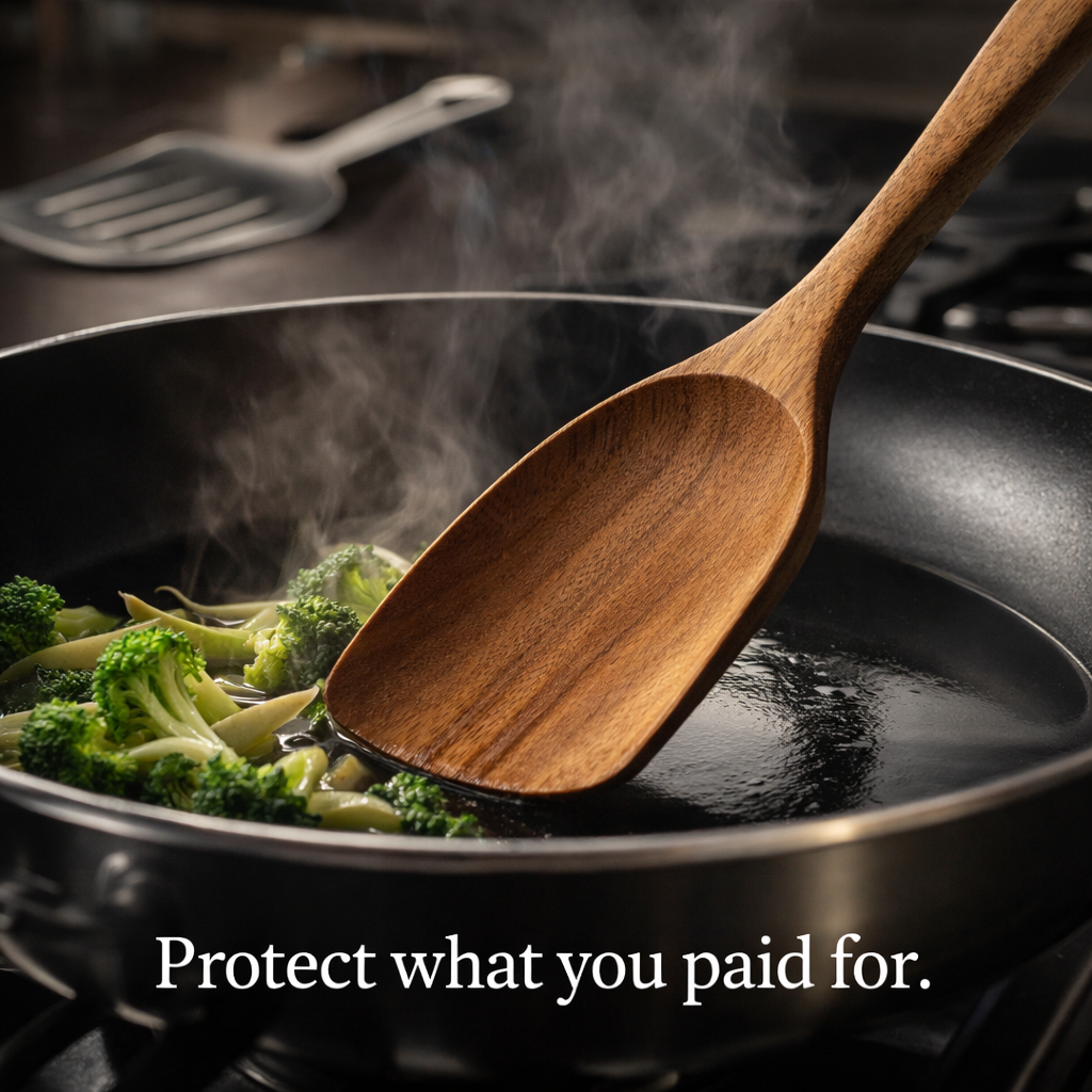 Absolutely not—that's the whole point. Metal utensils destroy non-stick coatings, releasing toxic PFAS chemicals into your food (yes, even from "safe" non-stick pans). Plastic might seem gentler, but it still causes micro-scratches that degrade the coating over time. Teak wood is naturally softer than any cookware surface yet strong enough to handle thick doughs and heavy stirring. Customers with all-cast-iron setups and high-end ceramic pots specifically praise these for being "perfect" for their cookware. One reviewer with ceramic pans said: "Highly recommend especially if you have ceramic cookware." Your $200 pan investment is safe.